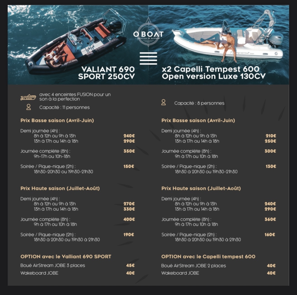 Avec des bateaux adaptés à toutes vos envies – qu’il s’agisse d’une balade tranquille en mer, d’une session de wakeboard ou même d’une virée entre amis ou en famille – Ô BOAT a ce qu’il vous faut. Leur flotte comprend des semi-rigides et des bateaux à moteur, tous bien entretenus et prêts à naviguer.